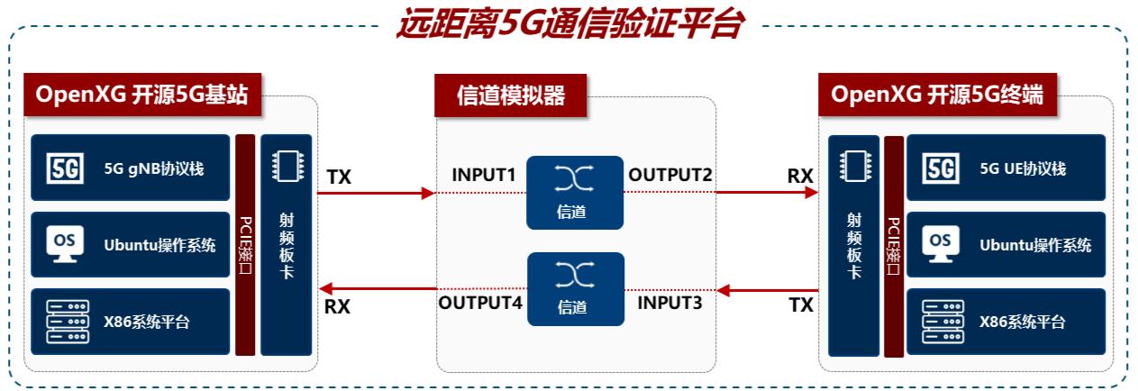 远距离5G通信验证平台主要由5G基站、5G终端和信道模拟器组成,上下行信号分别通过信道模拟器进行传输,通过信道模拟器模拟远距离通信过程中的时延、衰减、噪声,从而实现验证远距离通信特定的目的。